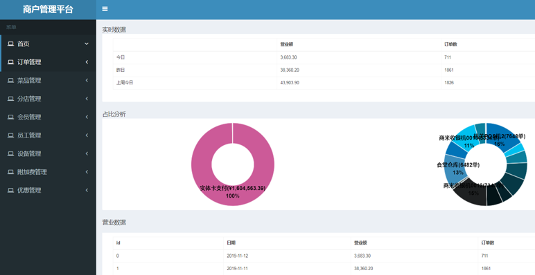 餐廳運(yùn)營(yíng)管理人員可在商戶管理平臺(tái)實(shí)時(shí)查看實(shí)時(shí)數(shù)據(jù)、營(yíng)業(yè)數(shù)據(jù)、占比分析等,實(shí)現(xiàn)在線進(jìn)行訂單管理、菜品管理,支持在售商品價(jià)格調(diào)整、上下架操作,支持修改售價(jià)及會(huì)員價(jià)格,可增減員工賬戶。支持各項(xiàng)數(shù)據(jù)導(dǎo)出。